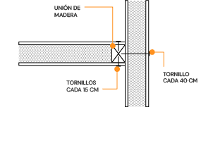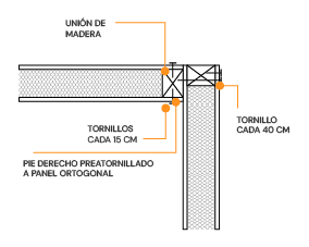En uniones en T, se embute un pie derecho en la cabeza del panel y se fija con tornillos Turbo Screw cada 40 cm desde la cara exterior.
