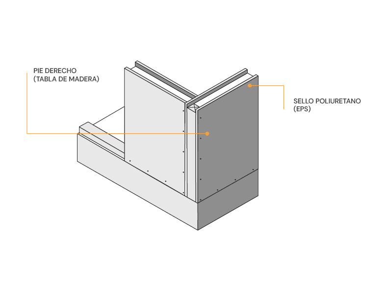 Se rebaja el núcleo de EPS para insertar un pie derecho, que se fija con tornillos cada 15 cm, reforzando la unión entre paneles.