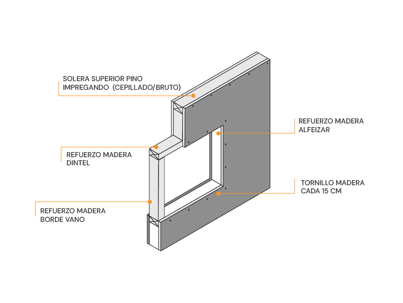 Los vanos, como puertas y ventanas, requieren refuerzos específicos para mantener la estabilidad estructural de los muros. Estos refuerzos se realizan con piezas de madera en todo el contorno del vano.