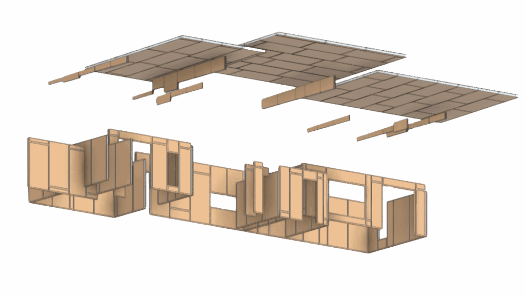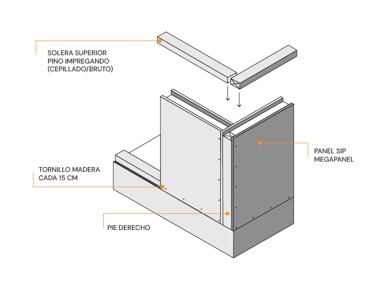 Una vez montados los paneles, se instalan las soleras superiores para consolidar la estructura antes de instalar la cubierta.