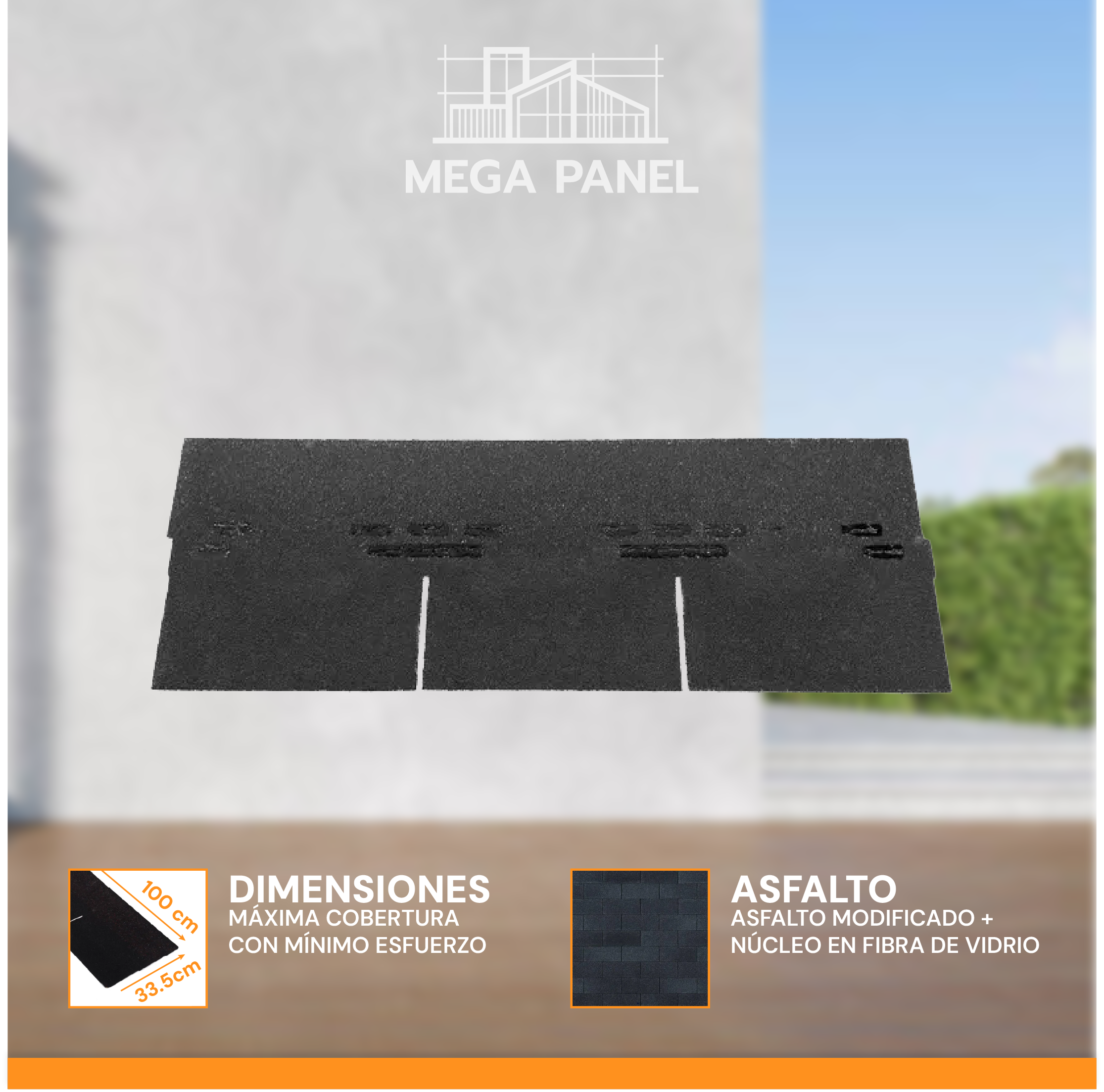 - Material base: Asfalto modificado y refuerzo central de fibra de vidrio